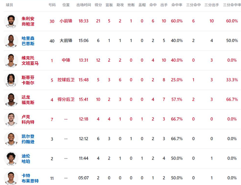 次节比拼,火箭虽未能有效缩小分差,但凭借顽强防守死死咬住局势,未让马刺进一步拉开差距。半场结束,马刺以70:60仅领先10分,比赛悬念依旧拉满。数据层面,两队首发球员表现均衡,半场均有3人得分上双。