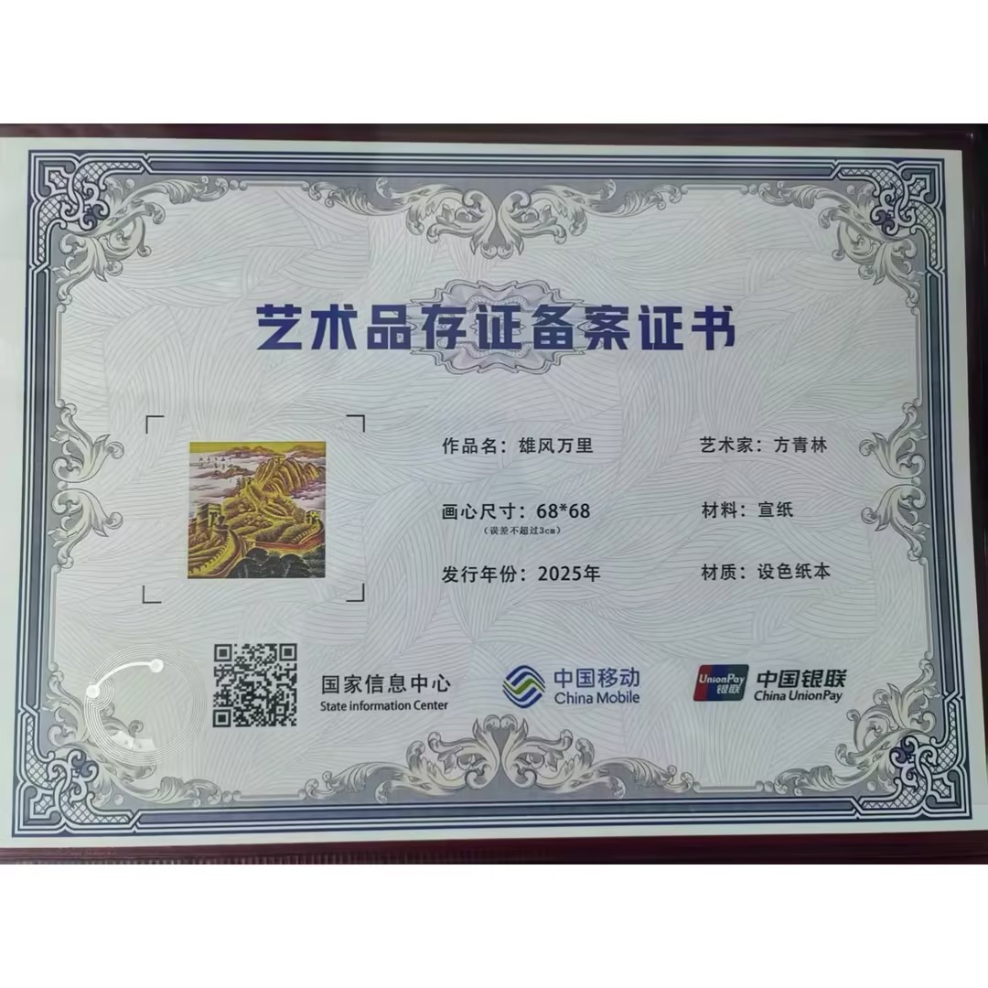 四、结尾:这张 68cm 的纸,到底值什么?是 “一克金粉的成本”?是 “方青林的签名”?是 “存证证书的二维码”?都不是。它值的是:当你站在这张画前,能看见 “自己的根”;当你把它传给孩子,能听见 “文化的接力”;当市场波动时,它是 “不会塌的价值锚点”。《雄风万里》不是 “一张画”,是 “把长城的魂、金彩的贵、存证的稳,揉成了一份能拿在手里的‘中国价值’”—— 你买的不是艺术品,是 “能传承的文化资产”。