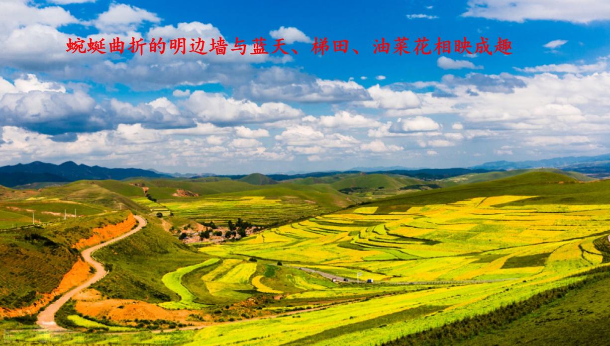 再次驶上国道316线,沿途的风光愈发醉人。车窗两侧,错落有致的梯田层层铺展,像是大地织就的绿色地毯。行至大路石观景台,眼前的景色更是惊艳——金浪翻滚的油菜花田一望无际,绿意盎然的青稞麦浪此起彼伏,与远处巍峨耸立的九天石门遥遥相望,蓝天下,棉花般的白云舒卷自如,山脊之上,明代边墙遗址蜿蜒盘旋,历史的厚重与自然的秀美在此完美交融,随手一拍每一帧都是大片。