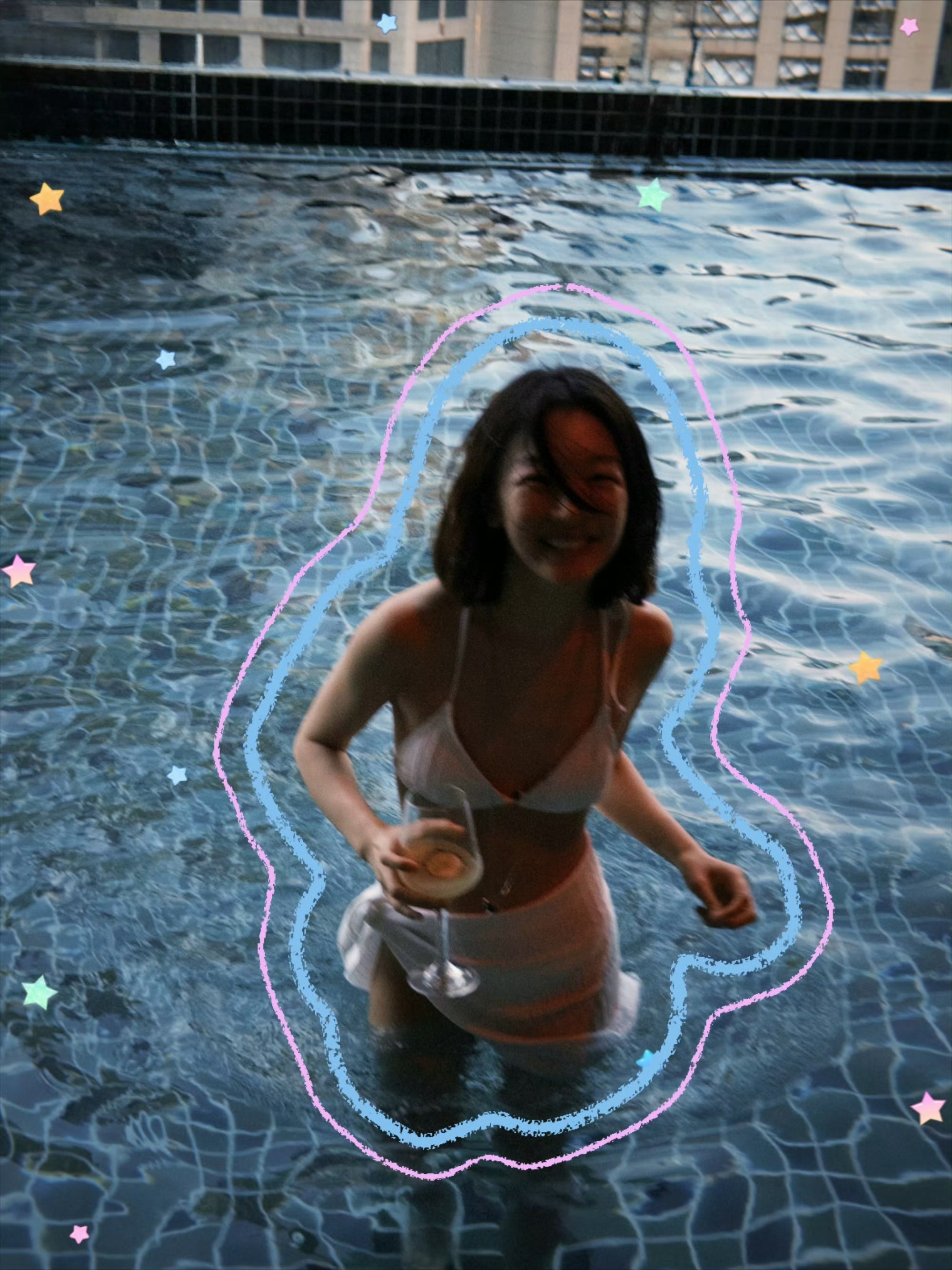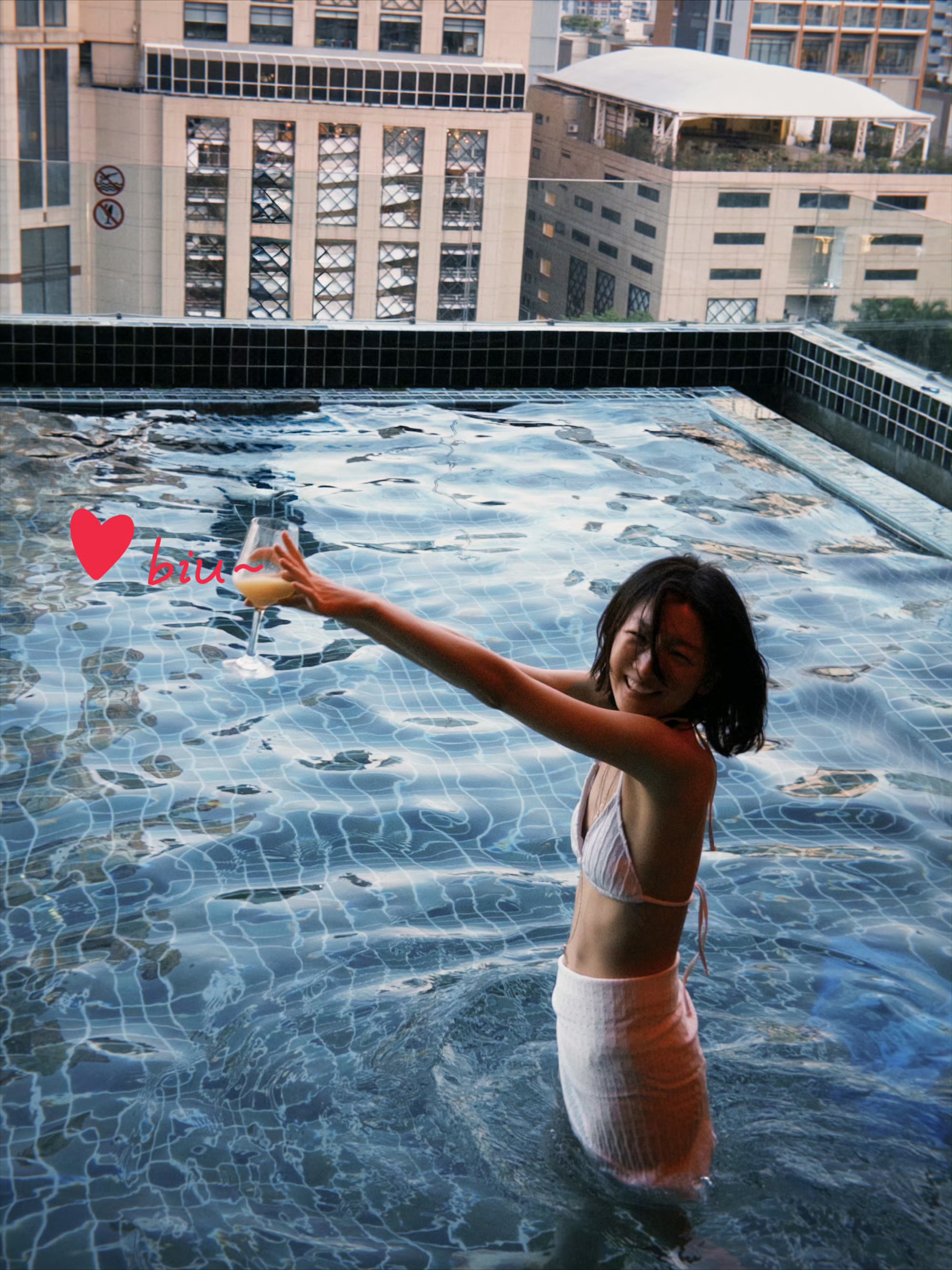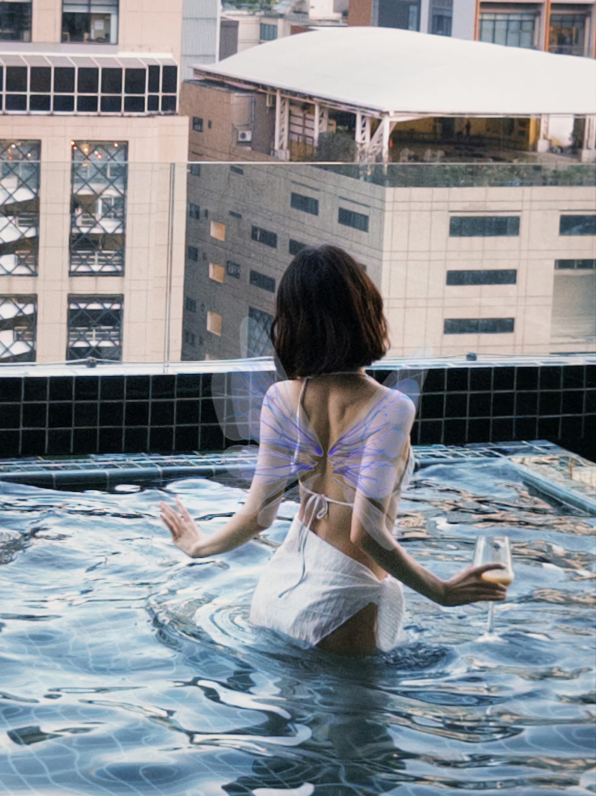 周冬雨的这组泳装是在室内拍的,可能是酒店的小游泳池。她身穿比基尼站在水里,背影还P了个漂亮的紫色蝴蝶翅膀。