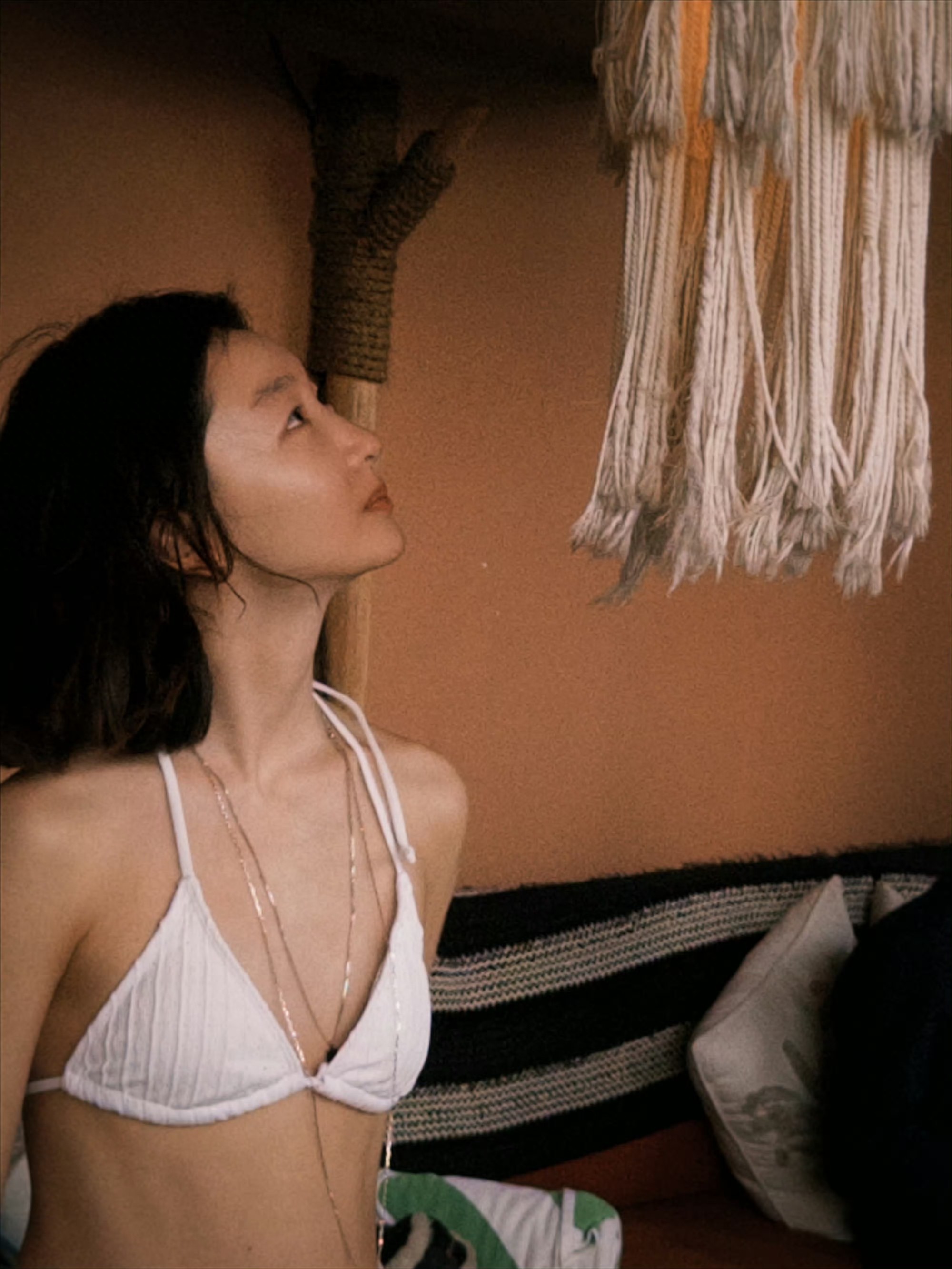 不过正是这个动作,把她的身材完全暴露了。上半身真的平平无奇,甚至这么性感的比基尼却没有一点性感的感觉。