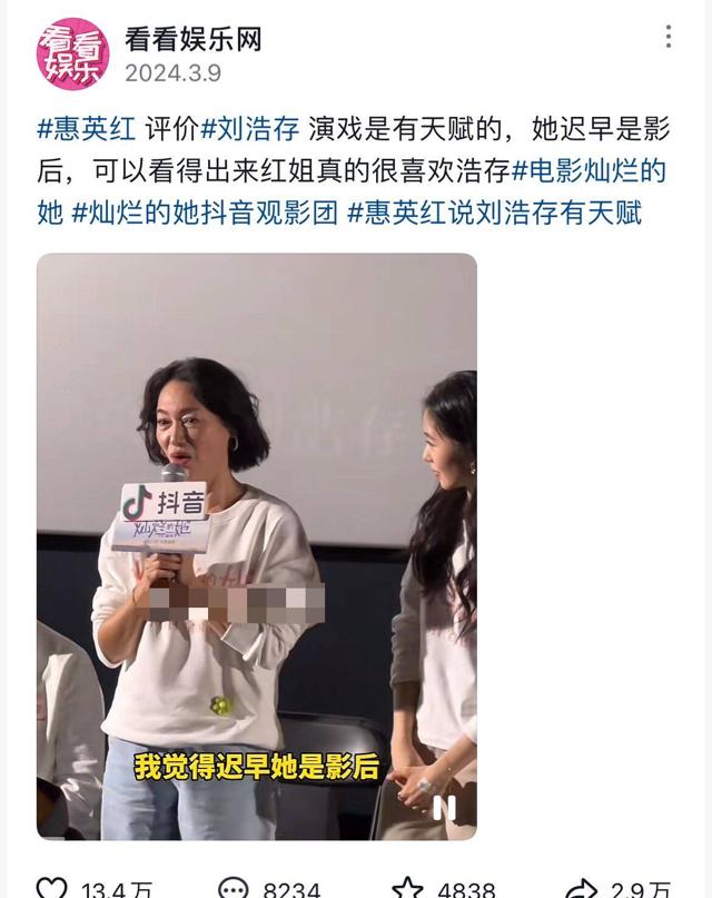 在《灿烂的她》路演现场,惠英红评价刘浩存很有天赋,是当影后的潜力股。