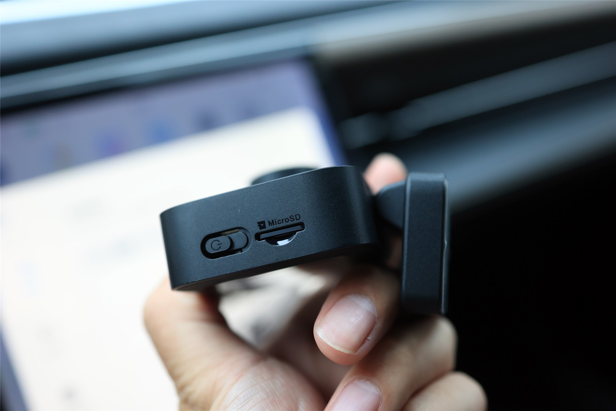 在记录仪的另一侧就是内存卡插孔和开关按钮。它最大支持了512G的内存卡,当监测到车辆碰撞时,最长可以保存长达1分10秒(碰撞前)+30秒(碰撞后)的紧急视频。要知道,我之前的记录仪一共也才支持30秒的紧急视频记录。
