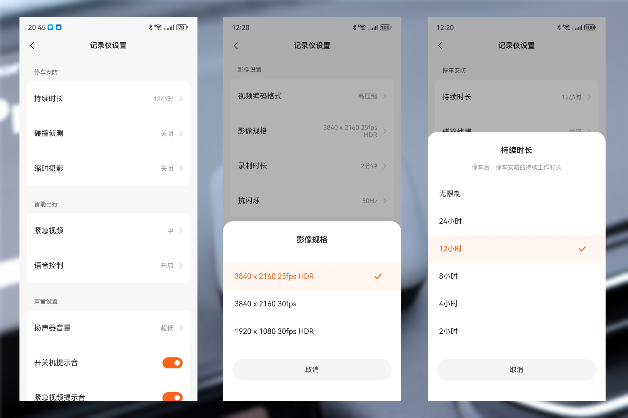 连接到手机APP以后呢,可以对行车记录仪进行更详细的设置,比如声音,拍摄格式等等,还有对停车监控更详细的设置,这种直观又便捷的操作方式,在使用过程中还是蛮省心的。