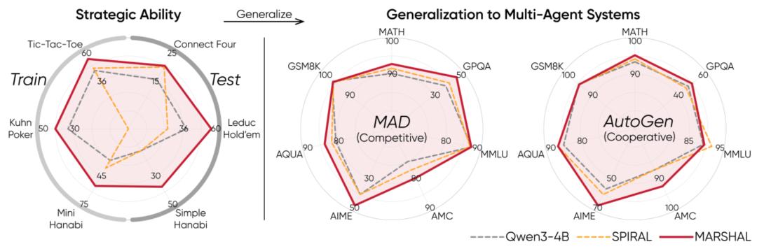 在策略游戏中习得的多智能体博弈能力,能够跨域泛化到通用的多智能体系统中,提升系统在一般推理任务中的表现。综合表现最强的 MARSHAL 通用智能体在数学测试 AIME 和问答测试 GPQA 中分别取得高达 10.0% 和 7.6% 的提升;在所有测试中的平均提升高达 3.5%。 能力泛化领域高度对齐:在竞争性多智能体系统 MAD 中,竞争性游戏(Tic-Tac-Toe)训练的模型表现更优;而在合作性多智能体系统 AutoGen 中,合作性游戏(Hanabi)训练的模型表现更优。