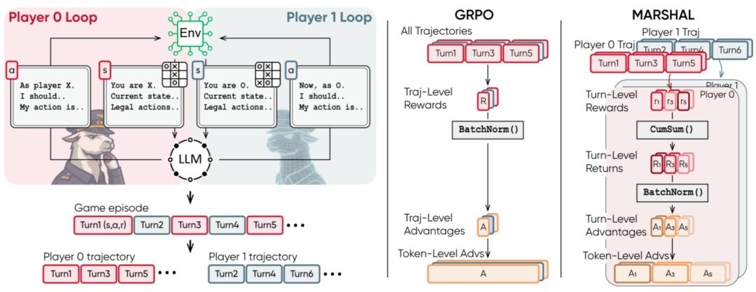 多轮交互的信用分配:现有的单轮 RLVR 方法难以精准地将最终结果回溯并分配给每一个具体的轮次或动作,进而影响了模型的有效学习。 多智能体的优势估计:不同智能体通常具有高度的异构性,其在优势估计(advantage estimation)中的优势基准(baseline)存在显著差异,导致多智能体联合训练难以收敛,策略表现波动剧烈。为了解决上述问题,为多智能体系统训练更强的推理模型,清华大学研究团队提出了 MARSHAL(Multi-Agent Reasoning through Self-play witH strAtegic LLMs)框架,通过策略游戏中的多智能体自博弈和端到端强化学习,激发大模型的在通用多智能体系统中的推理决策能力。