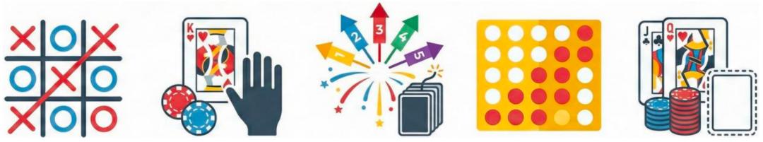 轮次级优势估计器 (Turn-level Advantage Estimator):针对多轮交互中的信用分配问题,MARSHAL 摒弃了经典单轮 GRPO 粗糙的轨迹级评估,引入精细的轮次级(Turn-level)奖励机制,并设计了 “先求累计和再归一化(Sum-then-Normalize)” 的方法进行稳定的优势计算。 分角色的优势归一化 (Agent-specific Advantage Normalization):针对角色异构性导致的回报分布差异,MARSHAL 实施了严格区分角色的归一化策略:在计算优势时,系统不再将所有智能体混为一谈,而是根据角色的不同(例如 “玩家 1” 与 “玩家 2”)将数据分组。为了培养全面的多智能体推理能力,研究团队精心挑选了六款策略游戏(其中三款用于训练,另外三款用于测试),涵盖了从简单到复杂、从竞争到合作的多种博弈类型。