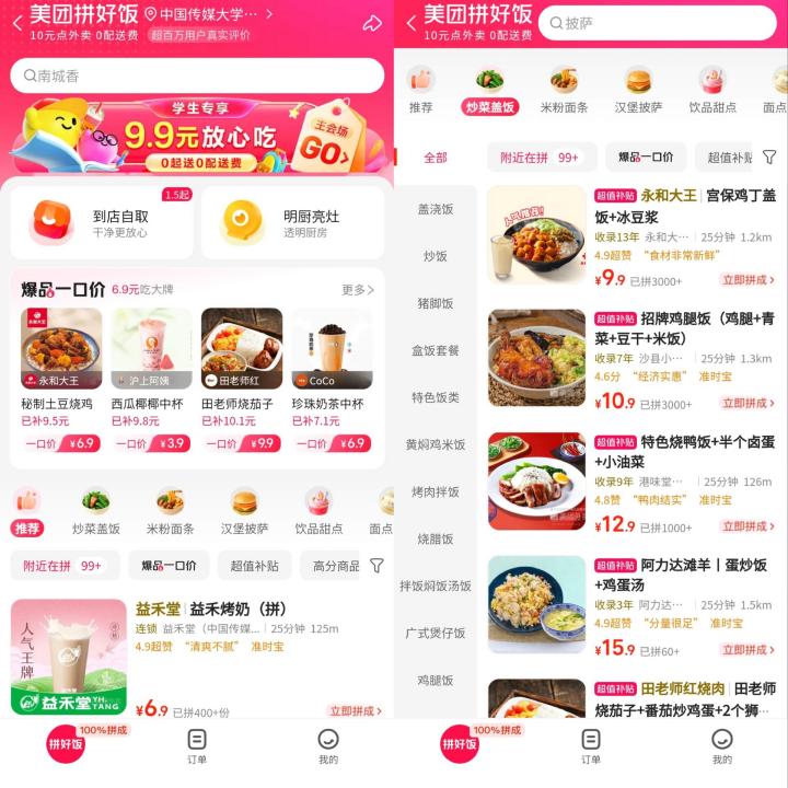 拼好饭页面核心品类主要覆盖炒菜、盖饭、米粉面条等正餐品类,更能满足消费者一日三餐需求。