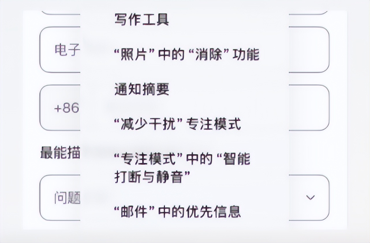 表格主要是收集,用户在使用苹果智能各项功能中,所遇到的问题。选项里包括写作助手、照片消除、邮件优先提醒、减少干扰的专注模式等等。