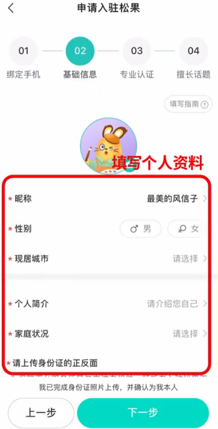 4、根据提示填写个人信息,包括昵称、选择性别、头像等,给自己写一个吸引别人并展示自我的个人简介。