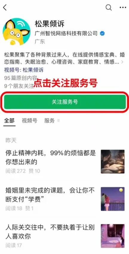 8、如果需要更详细的入驻教程,可以关注松果倾诉服务号-点击服务/菜单-【入驻松果】-【入驻帮助】。