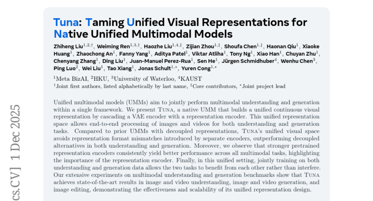 这项由Meta公司BizAI团队领衔,联合香港大学、滑铁卢大学等多个机构的研究团队开发的Tuna模型,于2025年1月发表在arXiv预印本平台上,编号为arXiv:2512.02014v1。这个名为Tuna的人工智能系统就像一个既会看画又会画画的全能艺术家,它能够同时理解图片视频的内容,还能根据文字描述创造出新的图像和视频。