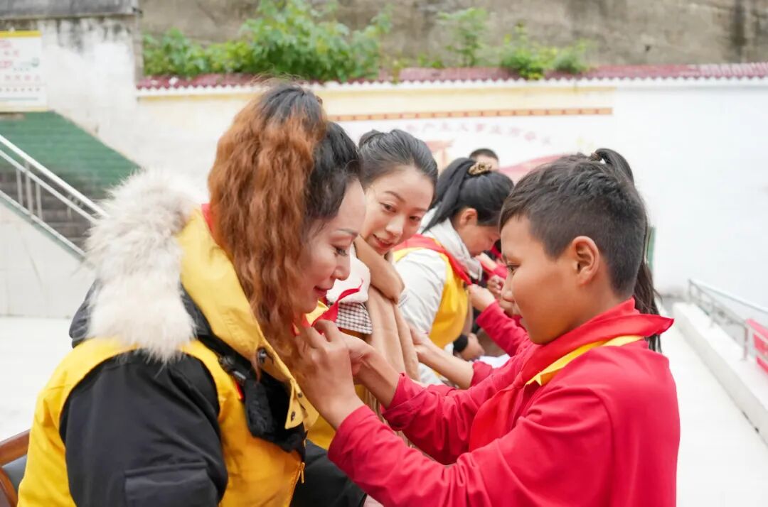 少先队员为爱心人士佩戴红领巾,胡志学校长细数校园的旧貌新颜,动情地说:“三十余年的老校终于迎来了新生。”