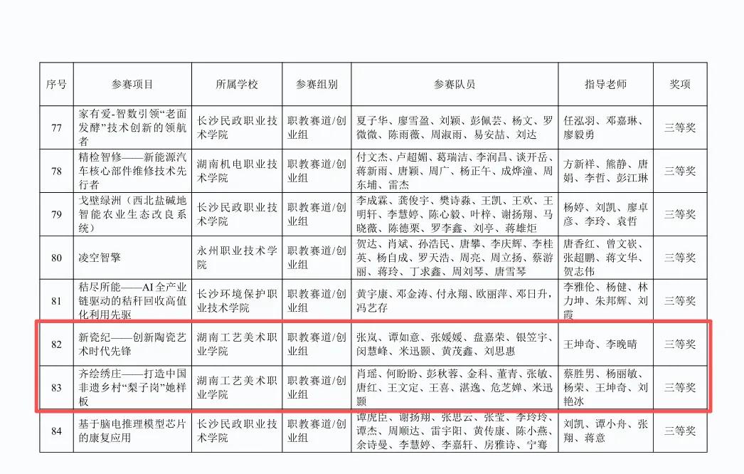 湖南工艺美术职业学院“新瓷纪——创新陶瓷艺术时代先锋”项目、“齐绘绣庄——打造中国非遗乡村‘梨子岗’她样板”项目获该赛道创业组三等奖。