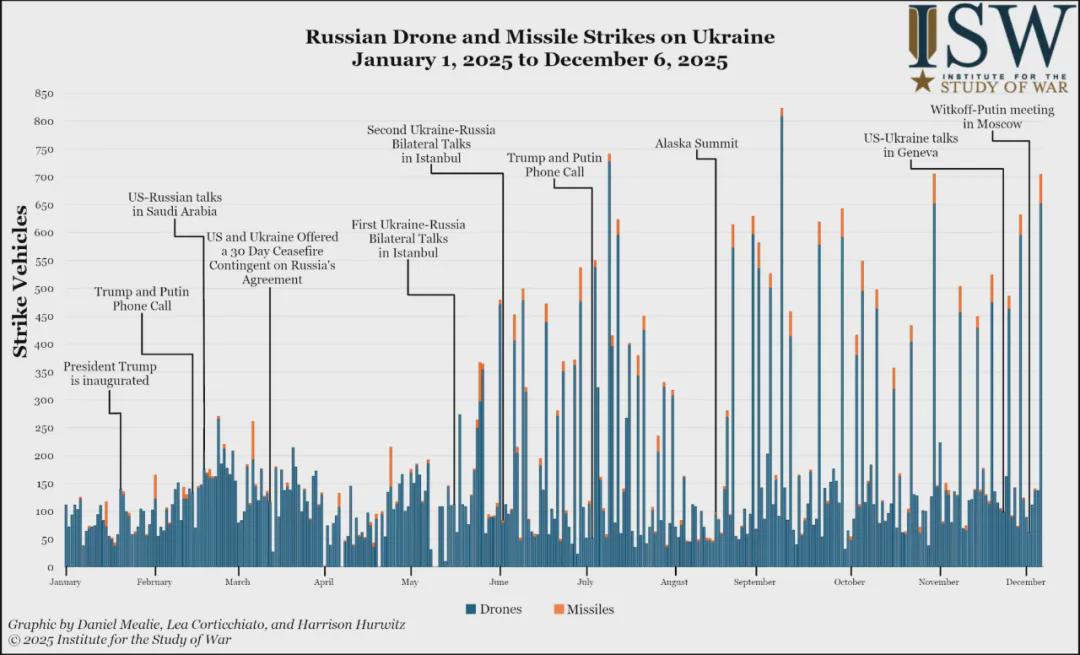 根据乌克兰空军报告称,12月5日~6日期间俄军共计发射了653架攻击型无人机,以及51枚导弹(其中17枚为弹道导弹)。