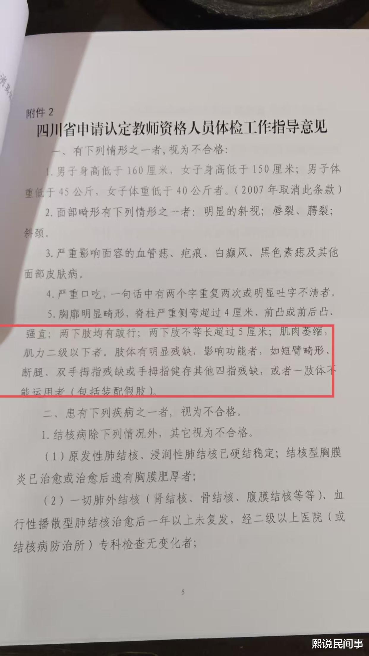 根据泸州市江阳区教体局的说法,雷女士不符合四川现行的教师资格体检办法。咱翻开《四川省申请认定教师资格人员体检工作指导意见》,里面明明白白写着:“肢体残疾,行路步态跛行,着装后不影响外观者,是否合格由体检医院根据专业判断”。但现实是,医院直接把 “装假肢” 等同于 “不合格”,仿佛老师站在讲台上,学生首先要盯着老师的脚,而不是黑板上的字。