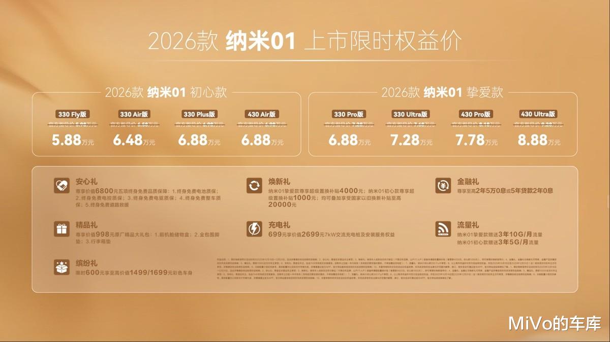 当价值远高于价格,是给予用户最大的诚意,也是纳米01面向市场最大的底气。新车特别推出「初心款」与「挚爱款」双版本共计8款车型,限时焕新指导价5.88-8.88万元,并且为用户准备了安心礼、金融礼、精品礼、缤纷礼等七重大礼。