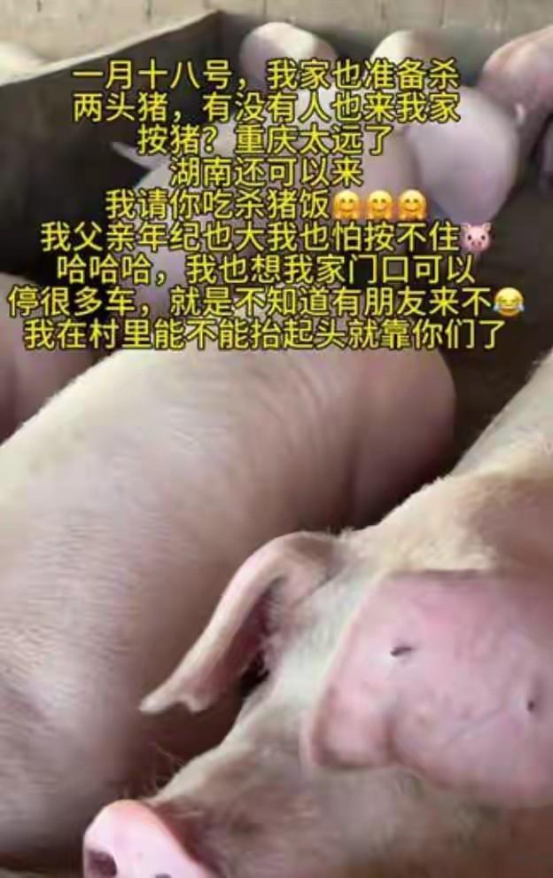 这股风如今也吹到了湖南。一位叫灿灿的姑娘,看了直播觉得真好,也想把这份热闹带到自己家乡。她学着呆呆妹的文案,邀请网友来家里帮忙按猪,一起吃顿热闹的刨猪饭。