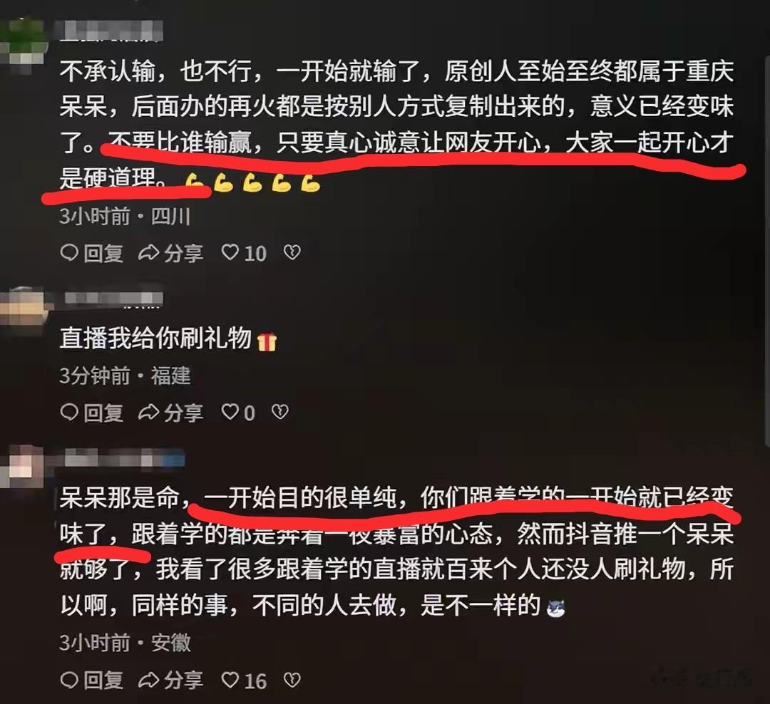也有人说,当开始模仿和比较的时候,事情最初的纯粹味道可能就变了。重庆呆呆那份无意间带来的惊喜和感动,是后来者很难完全复制的。