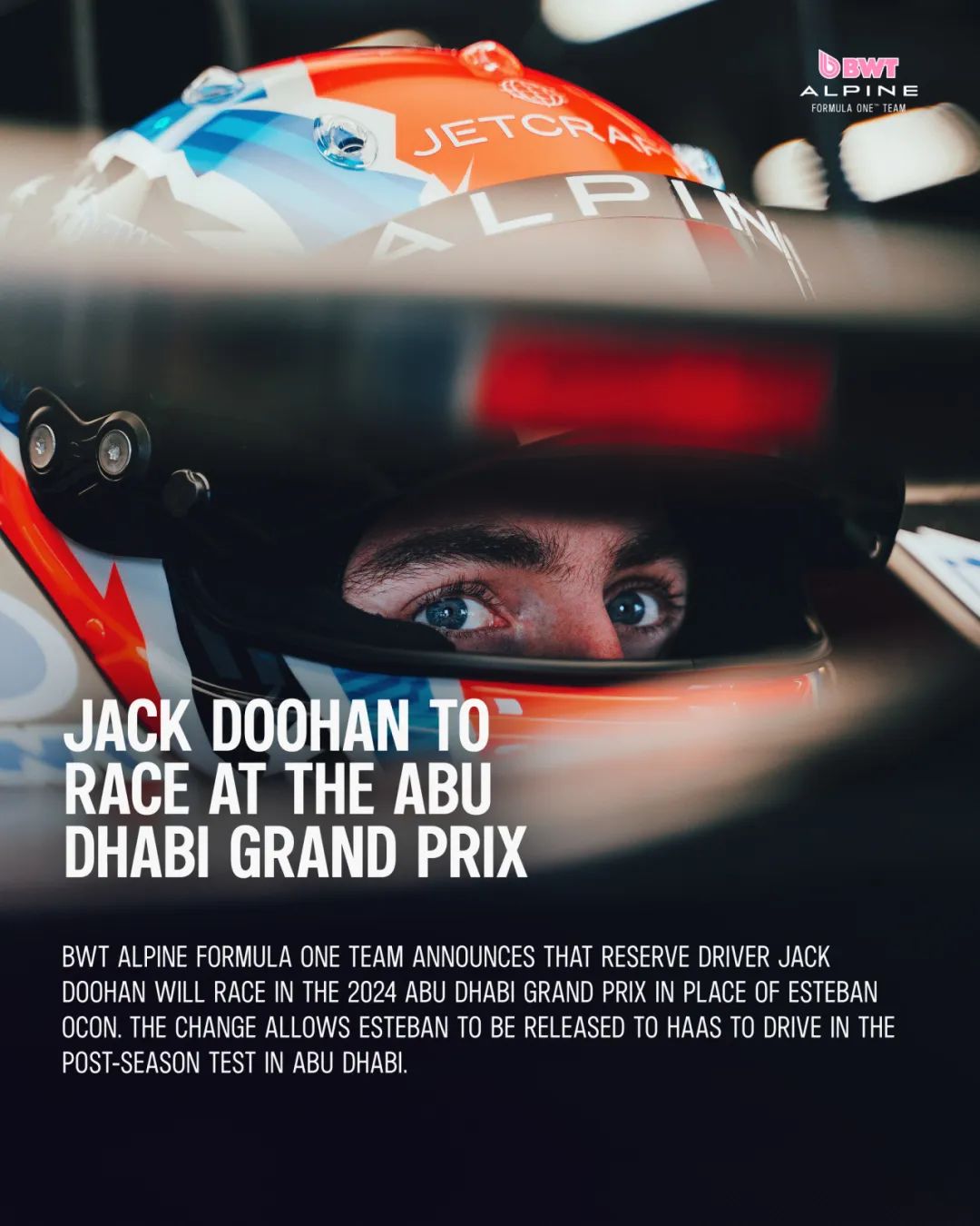 一、Alpine车队官宣奥康提前离队,阿布扎比F1大奖赛将会由杜汉接替其位置。