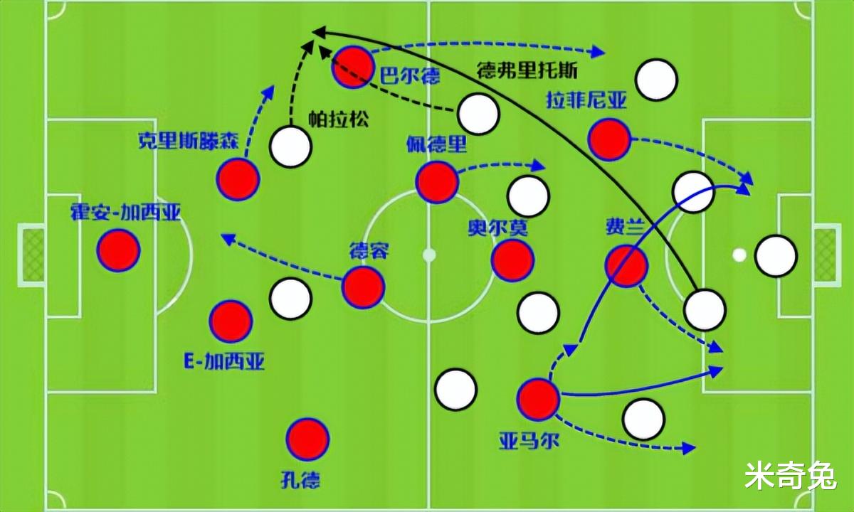关键是巴萨的进攻首先是建立在无球移动上,只有拉什福德跑肋部,那么托尼才能交叉跑去禁区后点。防守人在这样的移动下,很容易漏人,再加上巴萨不缺传球好手,就能打出极好的破防效果。