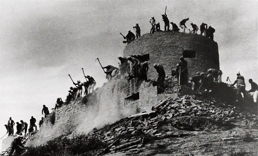 在步兵炮强烈的攻势下,坚固的城墙虽然没有被撼动,县城内的居民却因为害怕被炮击,将日本国旗挂满了城墙,以此来表达投降。