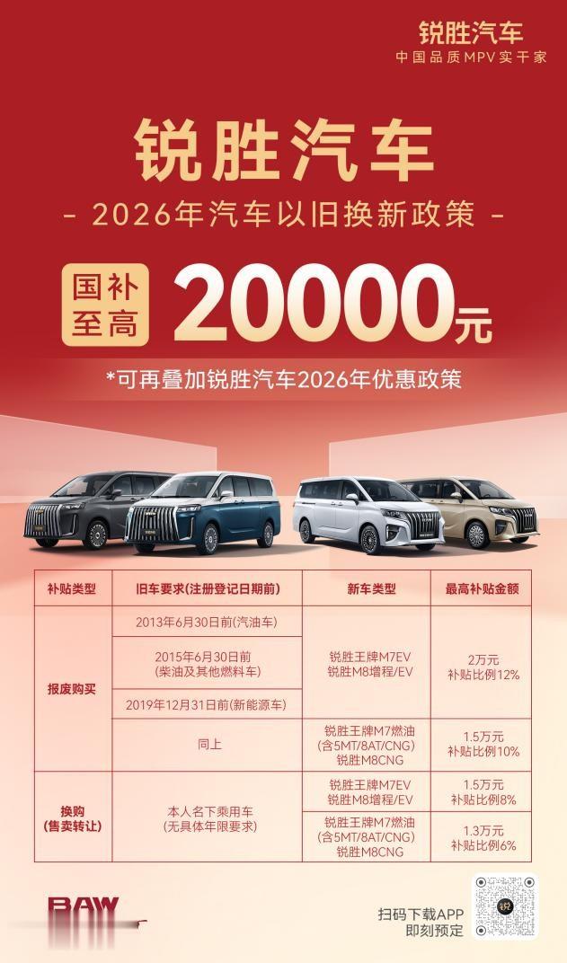 具体而言,锐胜汽车2026年以旧换新政策为消费者提供了两条清晰的路径。一是“报废更新”,即对达到规定使用年限的老旧机动车进行合规报废后购买新车;二是“置换更新”,即通过市场交易转让名下旧车后再购置新车。这意味着,家中那台可能已进入“退休”状态的旧车,其剩余价值被政策激活,最高可补贴20000元的购车资金,大幅度降低了购入锐胜M8的经济门槛。