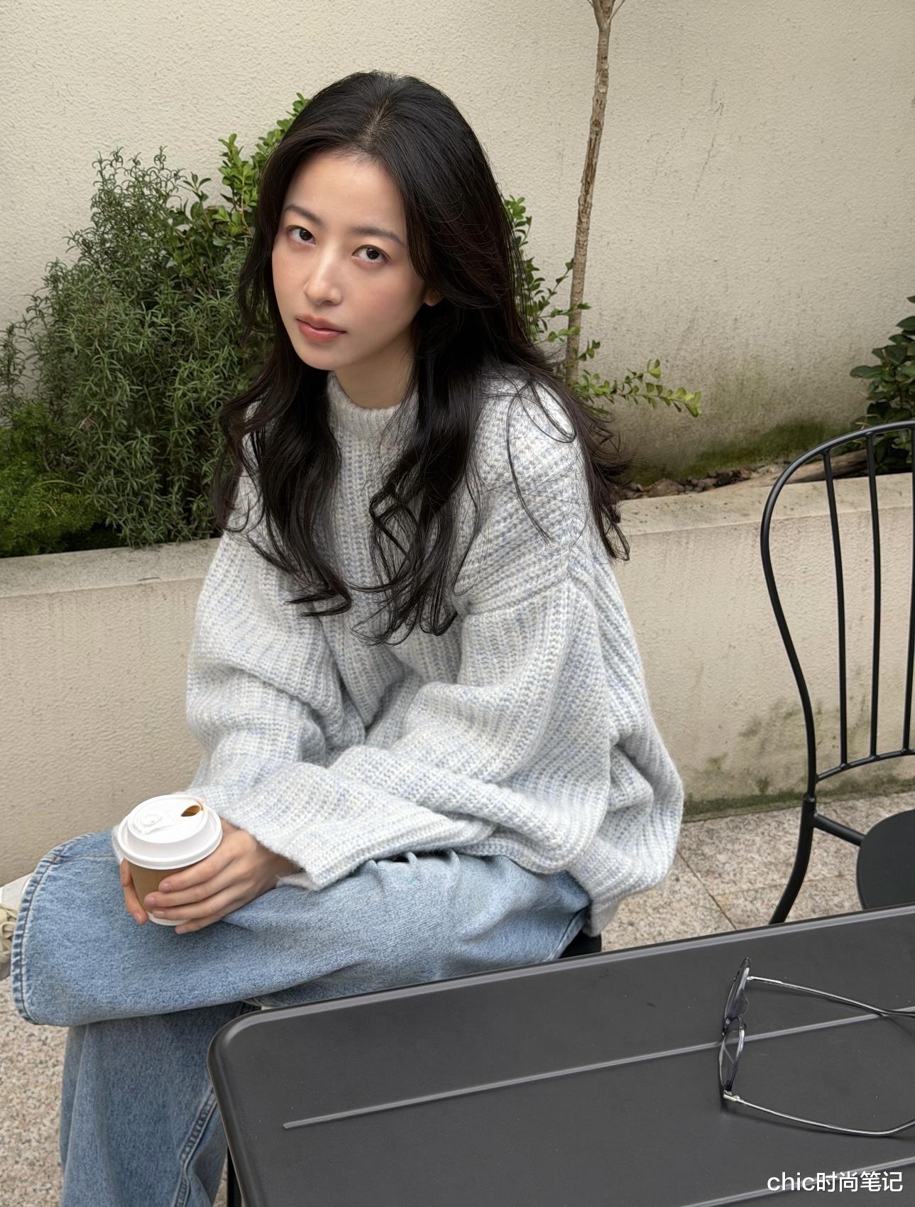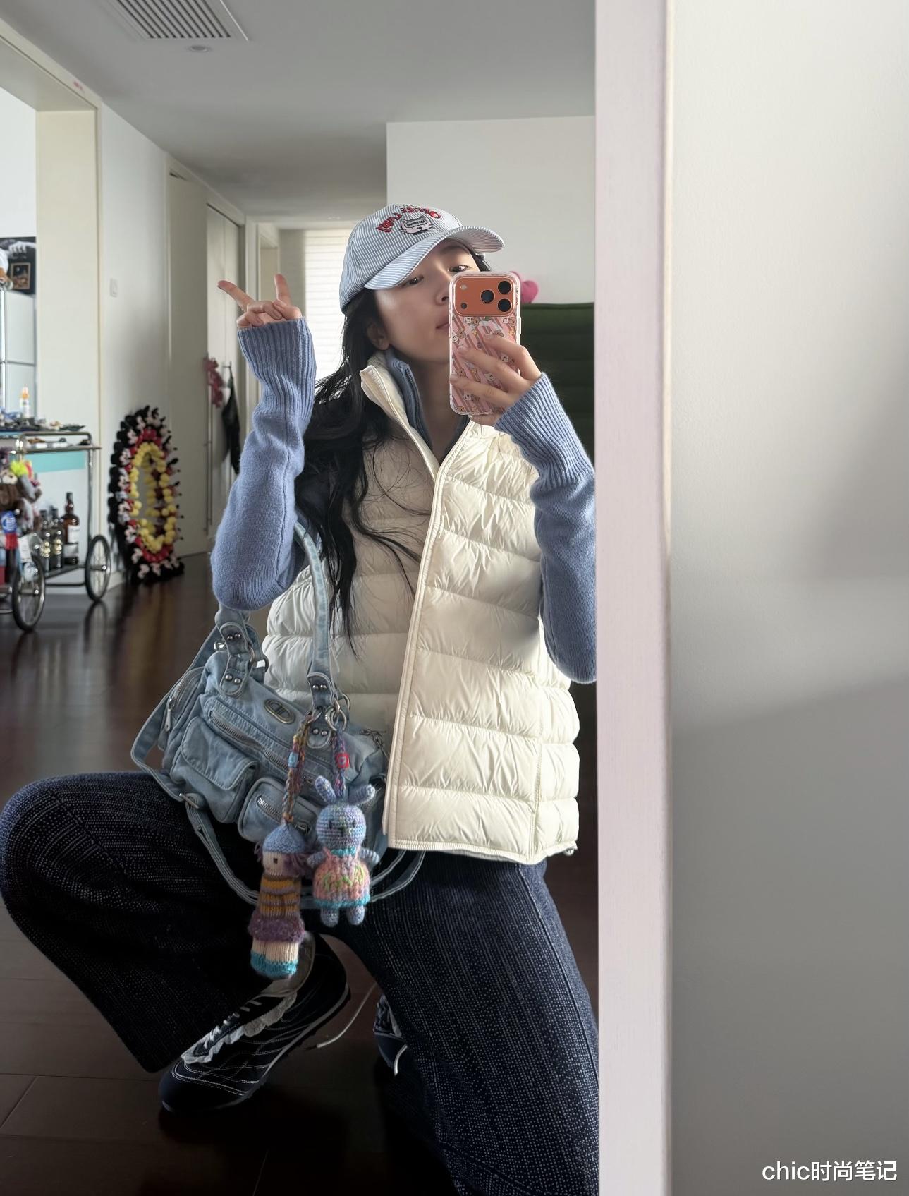白色羽绒背心搭配的雾蓝色针织毛衣是冬日里的一抹清新,搭配基础的裤子就很松弛。
