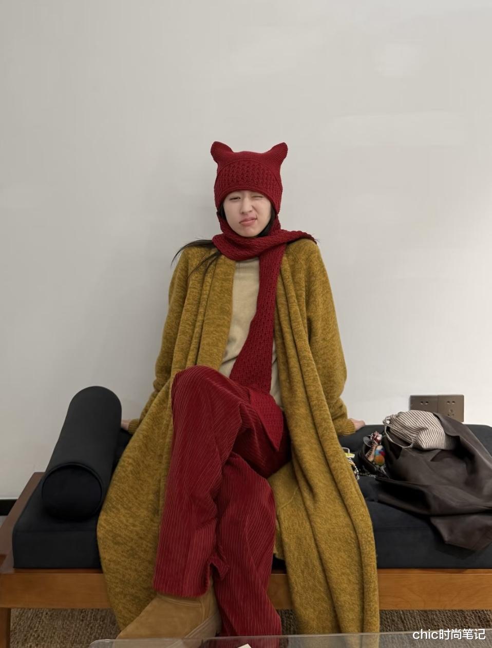 姜黄色毛衣外套是超长款的设计,搭配波尔多红色丝绒长裤,叠戴一条连帽围巾,个性与氛围感并存,红色元素的点缀亮眼又摩登。