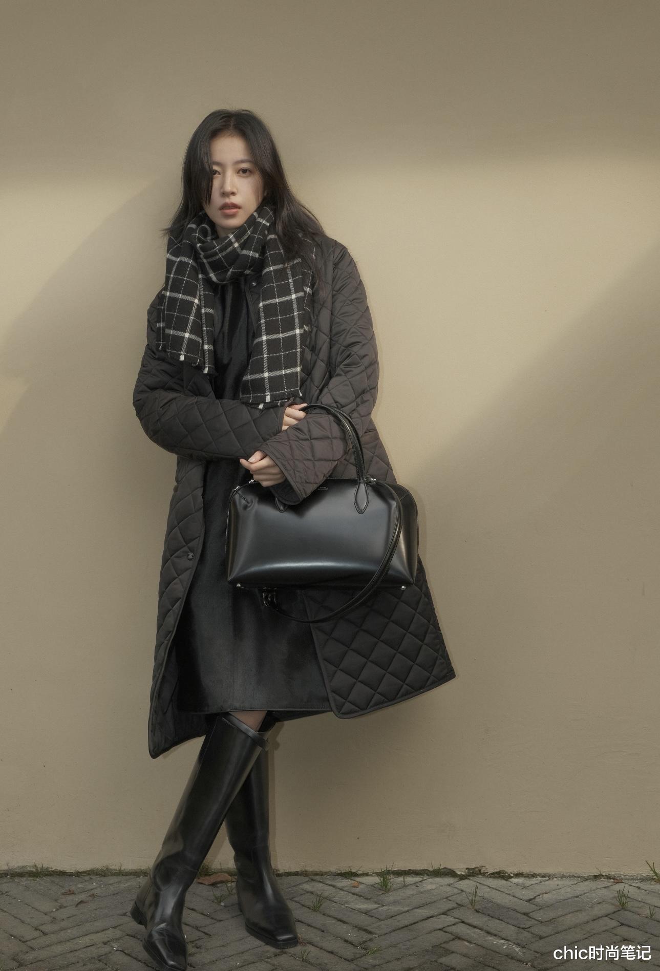 冬季少不了长款羽绒服的加持,内搭深灰色连衣裙,高筒皮靴和黑色皮包让厚重质感更加细腻,黑白格纹围巾的点缀超级治愈。