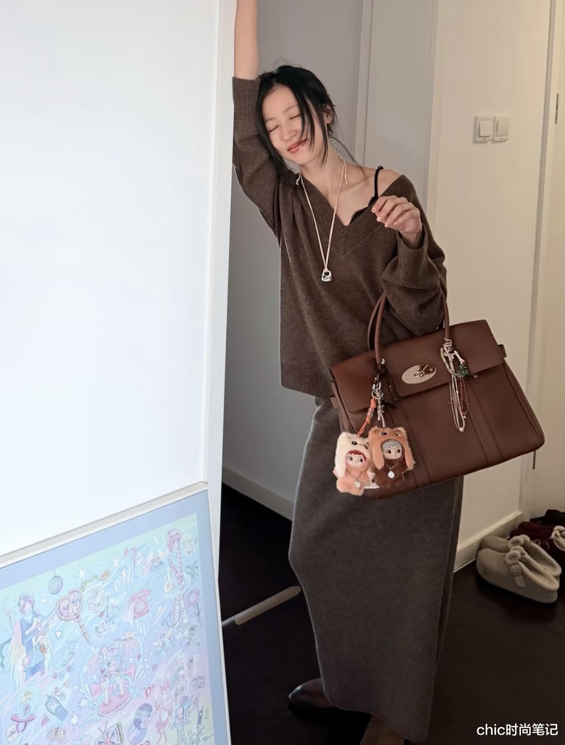 棕色V领针织衫搭配同色系针织半身长裙,松弛感一下子展现出来了,都是宽松的版型,再搭配一个大地色系的包包让穿搭色彩有一个明显的过渡,层次感分明。