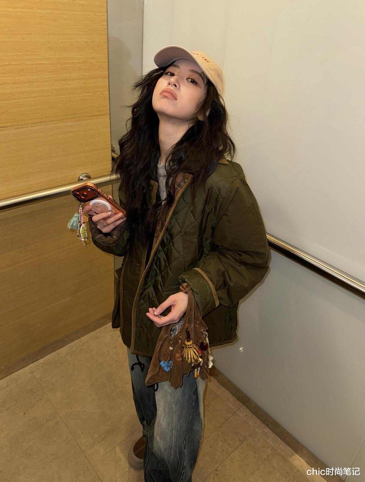 同样的军绿色菱格纹羽绒服搭配的是深色系渐变牛仔裤,也是宽松大版的款式,不会过于贴合身材,百搭又松弛,点缀上棕色系元素,这套look自带冬日氛围感。