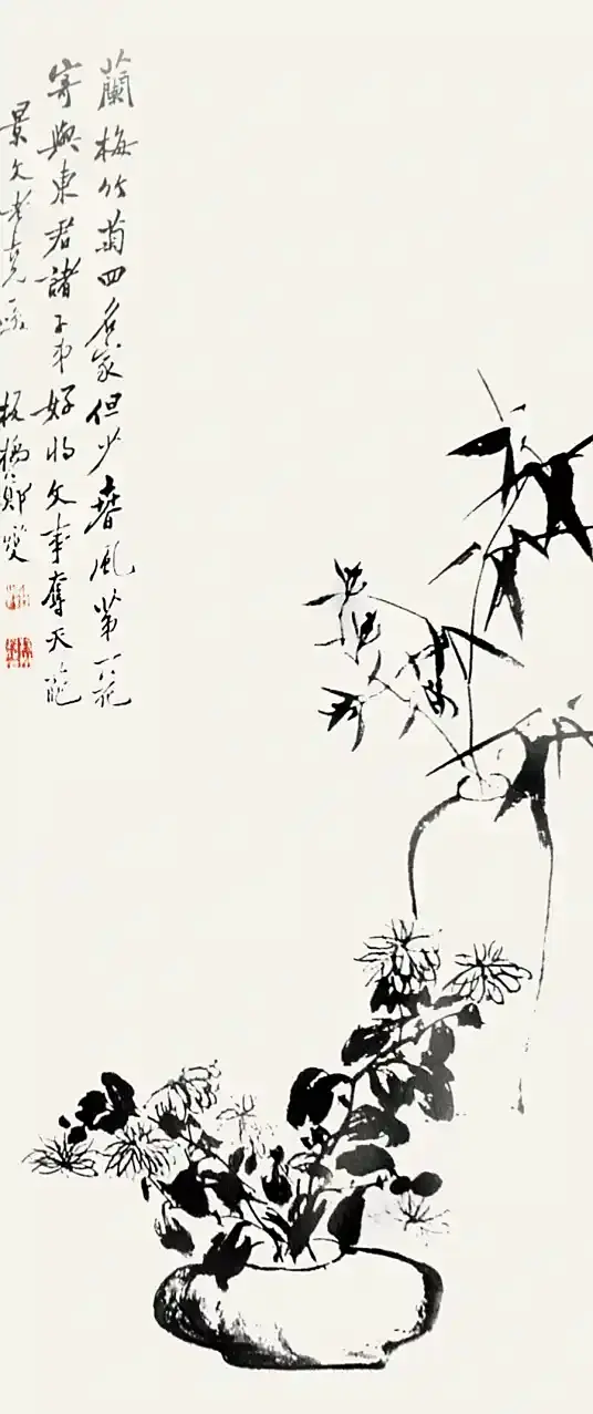 笔墨:既有工笔重彩的精细妍丽(如宋代院画),也有写意水墨的潇洒奔放。尤其在吴昌硕等海派画家笔下,清供图以金石书法入画,用笔老辣,色彩对比强烈,充满了雄浑古拙的力度。