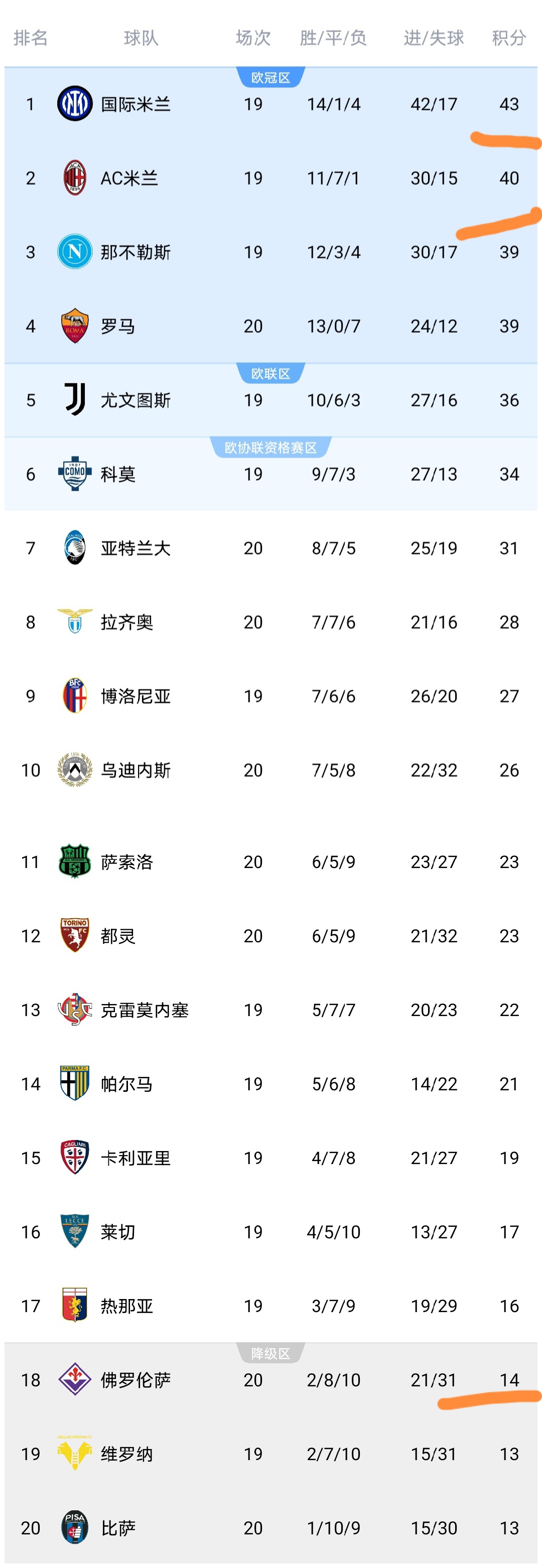 可以看到国米仅领先AC米兰3分,领先那不勒斯和罗马都是4分,差距都不大。今年意甲冠军的争夺真是胶着。佛罗伦萨目前已经距离保级区不远了,佛罗伦萨队看到了保级希望。