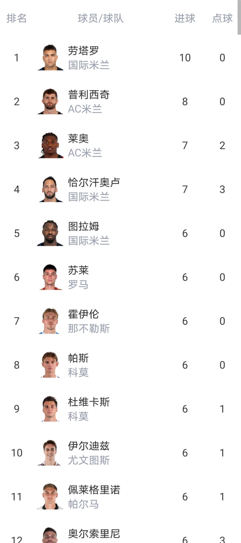 射手榜方面,劳塔罗依然领跑,但是仅领先第2的普利西奇2球,比第三的莱奥多3球,领先优势不大,可以说意甲金靴的争夺还是很激烈的,跟争冠一样,非常刺激,前十二的球员都有很大机会获得金靴,就看后面的比赛谁能状态更出色了。