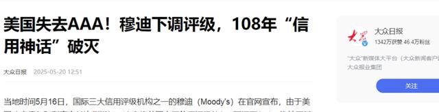 中美签订联合声明后仅过了四天,三大国际信用评级机构之一的穆迪,宣布下调美国的主权信用,将美国从Aaa降到了Aa1。