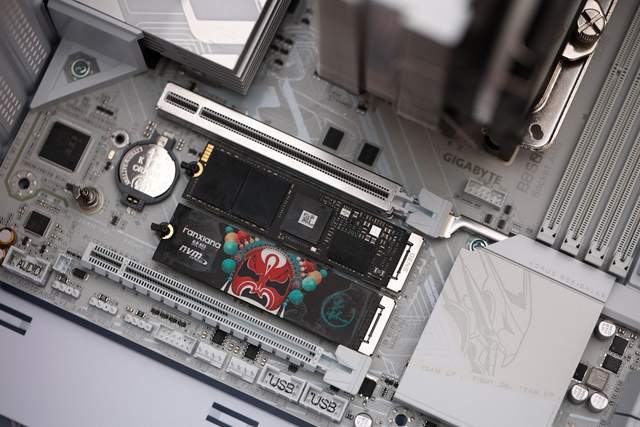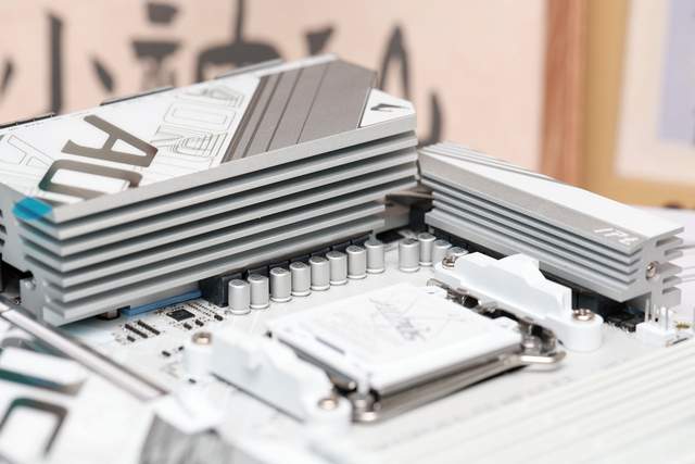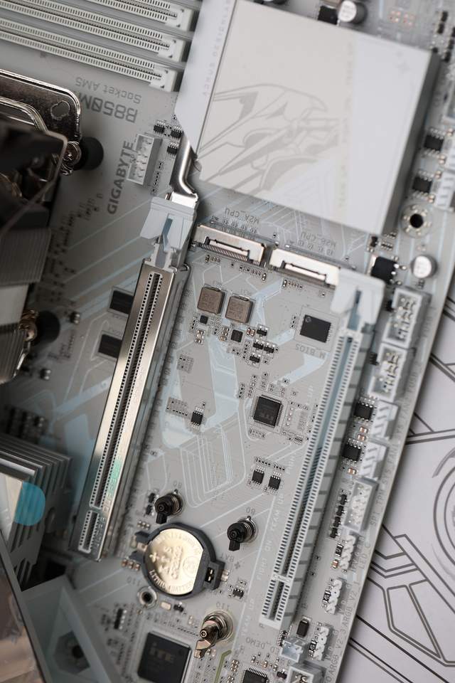M.2接口上,技嘉冰雕B850M AORUS ELITE WIFI6E ICE提供了两个,两者共用一个散热装甲(这是拆除散热装甲后),其中上方靠近CPU的为PCIe 5.0 x4 M.2固态插槽,下方为PCIe 4.0 x4固态插槽。值得一提的是,无论是显卡插槽还是M.2插槽,均采用了快易拆设计,很好的方便的装机。