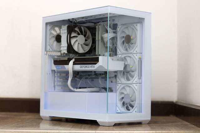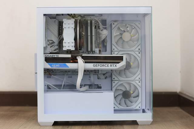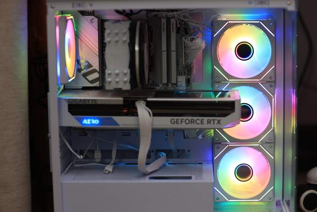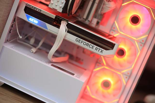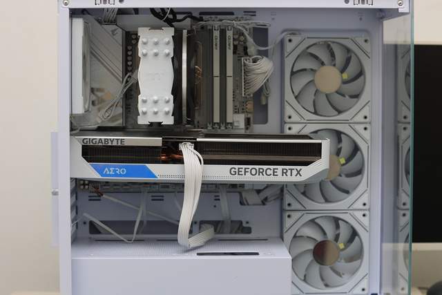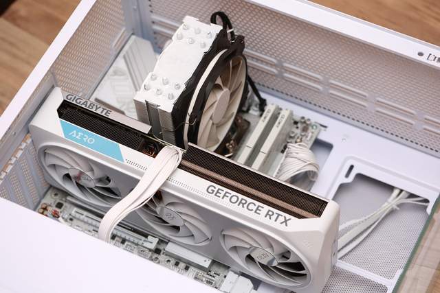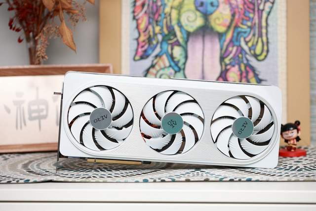 接下来就是另外一个重要的配件了,这次搭配的是技嘉RTX 4070 Ti SUPER 雪鹰,同样采用了纯白的配色,正面三个90mm的风扇,采用正逆转设计,并支持智能启停,负载低的时候不会转,更加的节能静音。