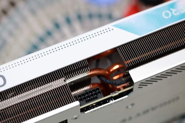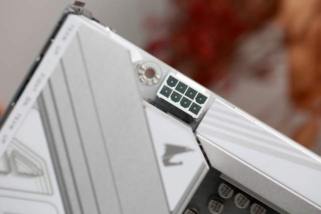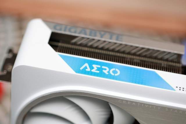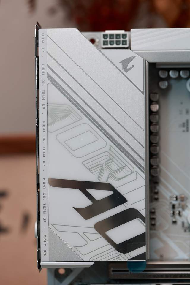 显卡顶部的设计,AERO的LOGO是此外唯一的灯效,默认上机是白色,可以通过软件调节。其实作为白色主题的主机,个人认为灯效倒不是必要的,简单的纯白本身就是一种极致的美学。