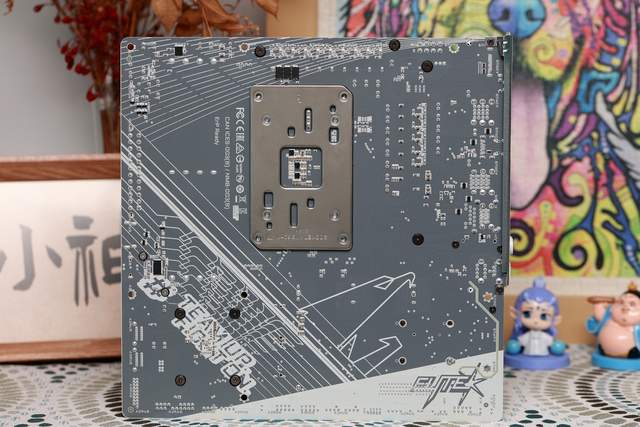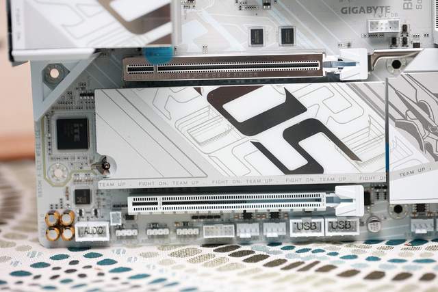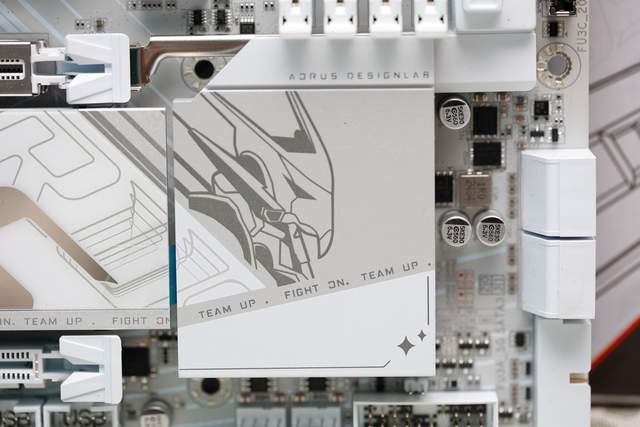 技嘉冰雕B850M AORUS ELITE WIFI6E ICE主板的背面,这次也不是仅仅可以看到满满的电子元件,还增添了漂亮的涂装,team up,fight on的标语增加了趣味性,同时也是增加了主板的颜值。