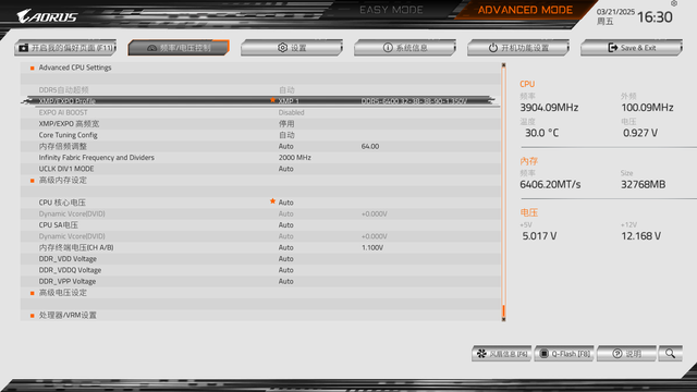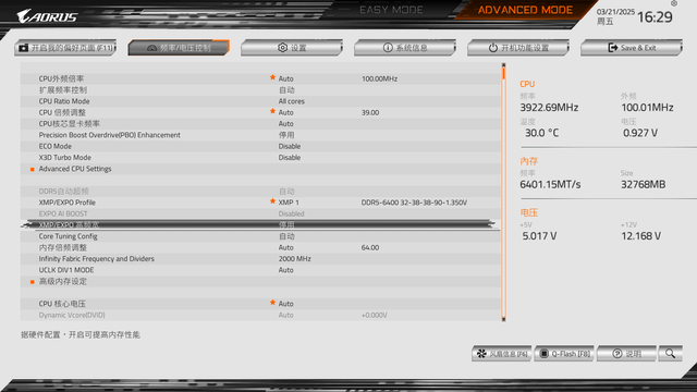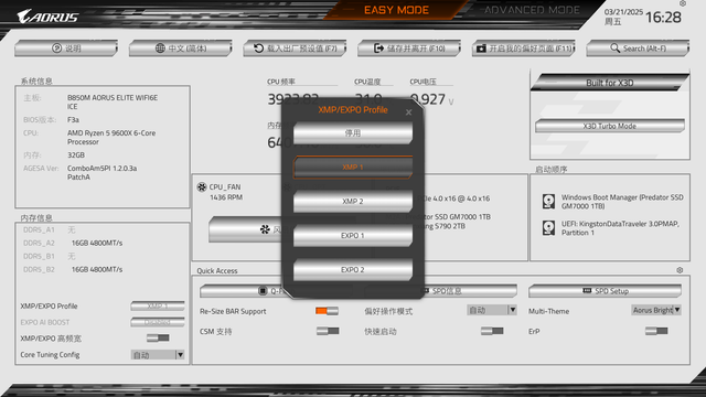 技嘉B850M AORUS ELITE WIFI6E ICE主板的BIOS界面,有简易和进阶两种模式,个人认为其中有两个比较重要的功能,一个是右上角的X3DTurbo模式,可以很好的释放整机的游戏性能,另外一个就是左下角的内存超频,这两个功能都是一键设置,小白也很好上手。