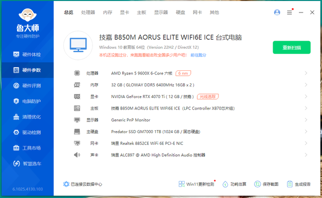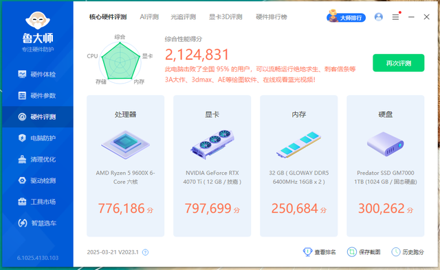 整机的硬件配置,R5 9600X处理器+32G DDR5 6400MHz内存+RTX4070Ti显卡,跑分上之前也上图了,212万还是可以的。