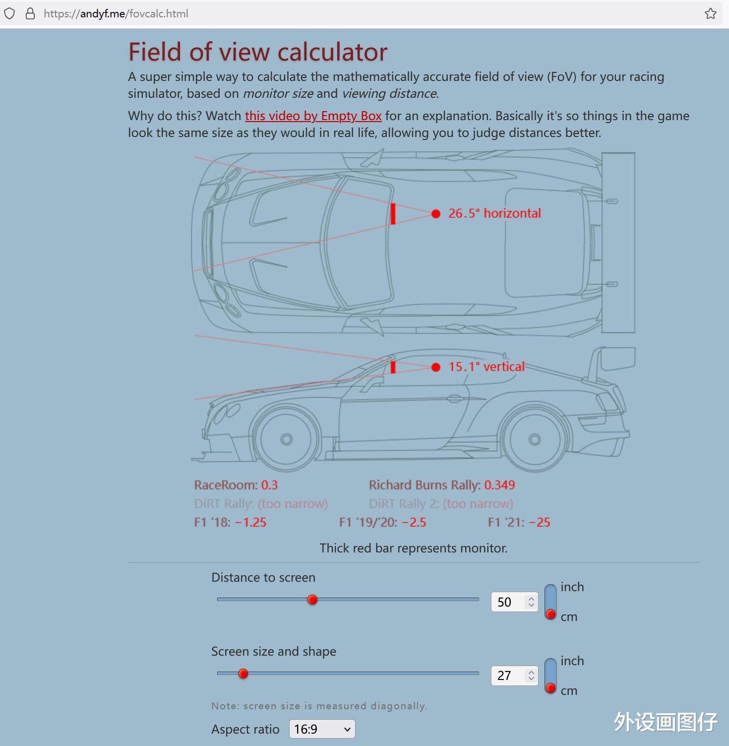 andyf的FOV计算器更为直观,但是调节的参数较少,例如没有办法针对三联屏或曲面屏作出细化计算。如果使用的是像雷鸟U9 57吋显示器,andyf的FOV计算器就会很合适。