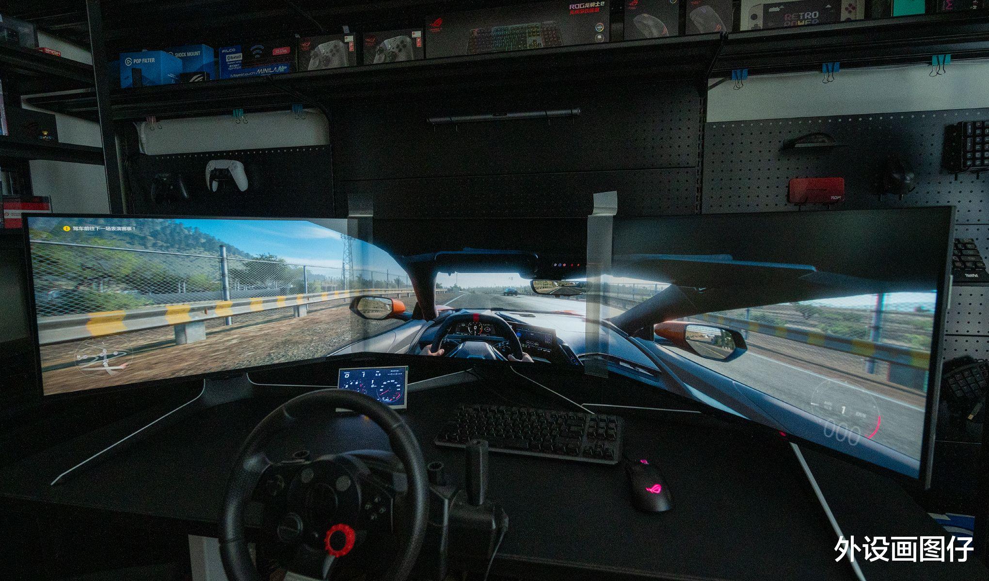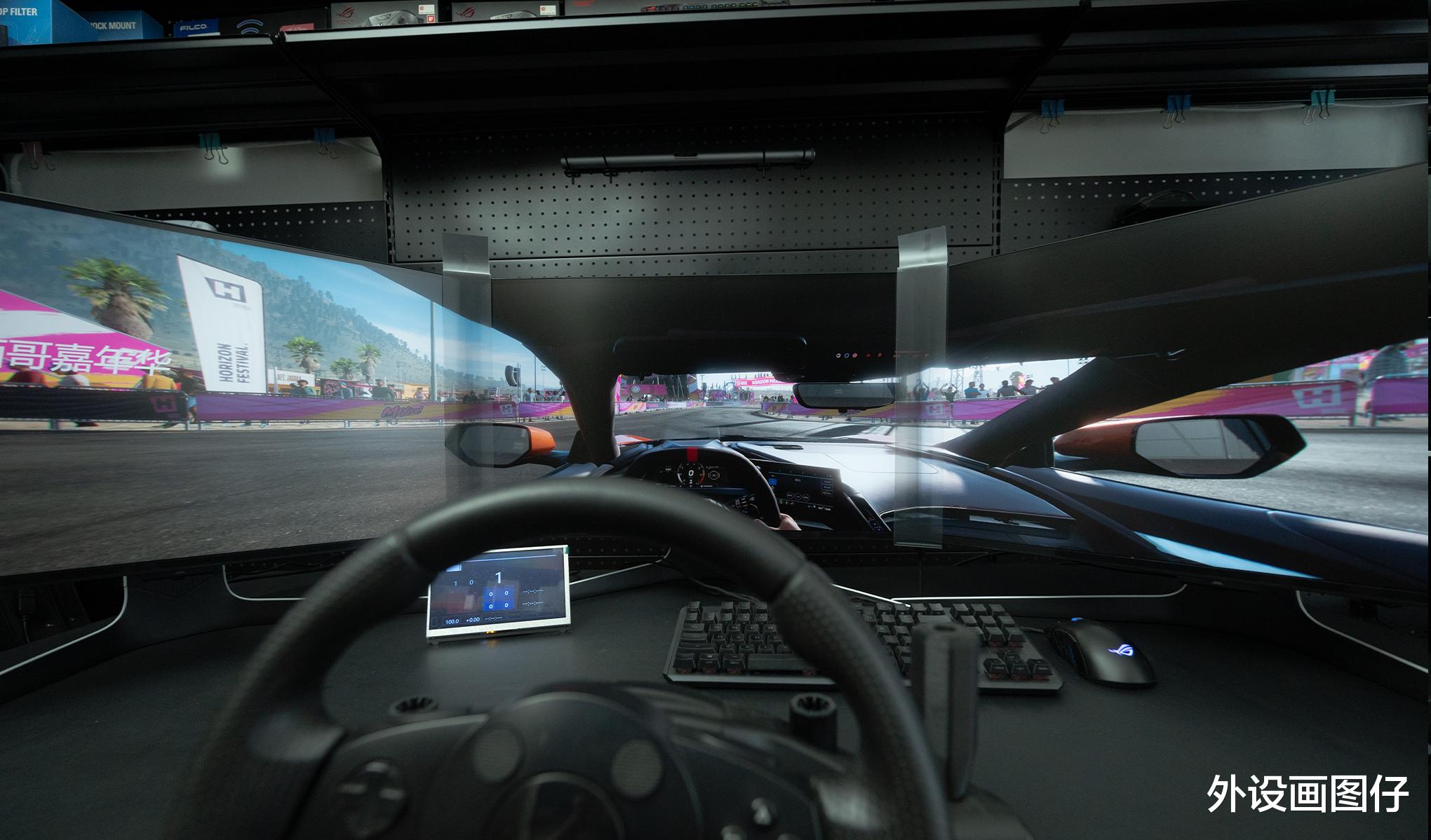 FOV调节恰当,边框完美消除后,开启神力科莎体验,感觉从方向盘看过去的视角,是很接近赛车车内视角的,至此72吋7K(7680*1440) 240Hz的超宽MiniLED显示器的搭建算是完成了。