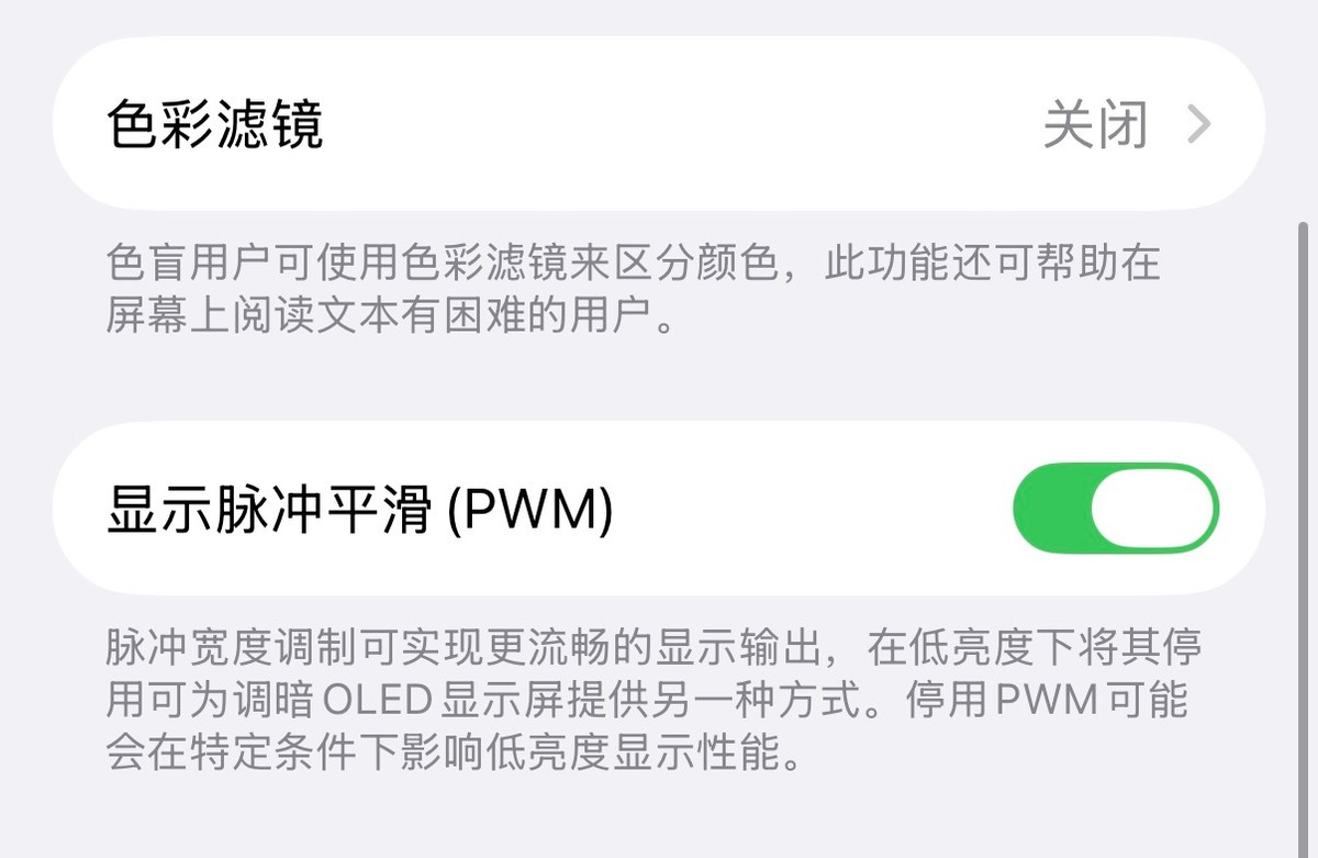 iPhone 17 开启类 DC 调光的方法在 iOS 26 中,苹果为 iPhone 17 全系列增加了一个隐藏功能:显示脉冲平滑。这个词很好理解,显示脉冲=PWM,平滑就是调光方式更“温柔”,它融合了 PWM 调光和 DC 调光两种方式。
