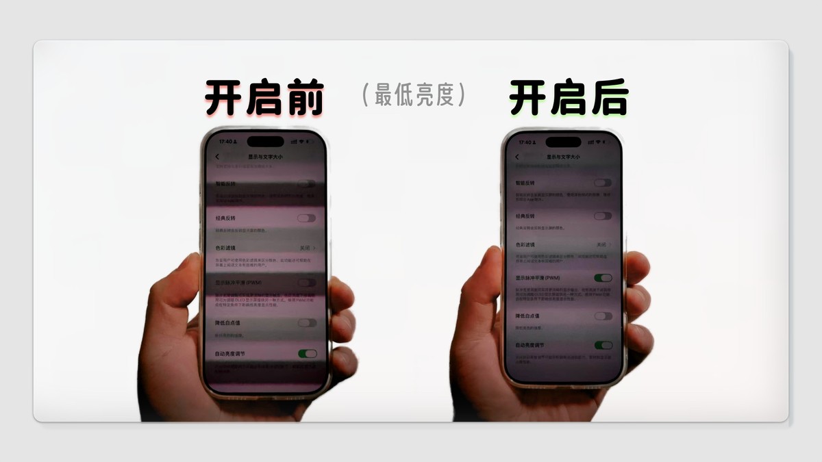 不过不知道什么原因,类 DC 调光只有 iPhone 17 系列才支持,老款 iPhone 都无法开启这一功能。