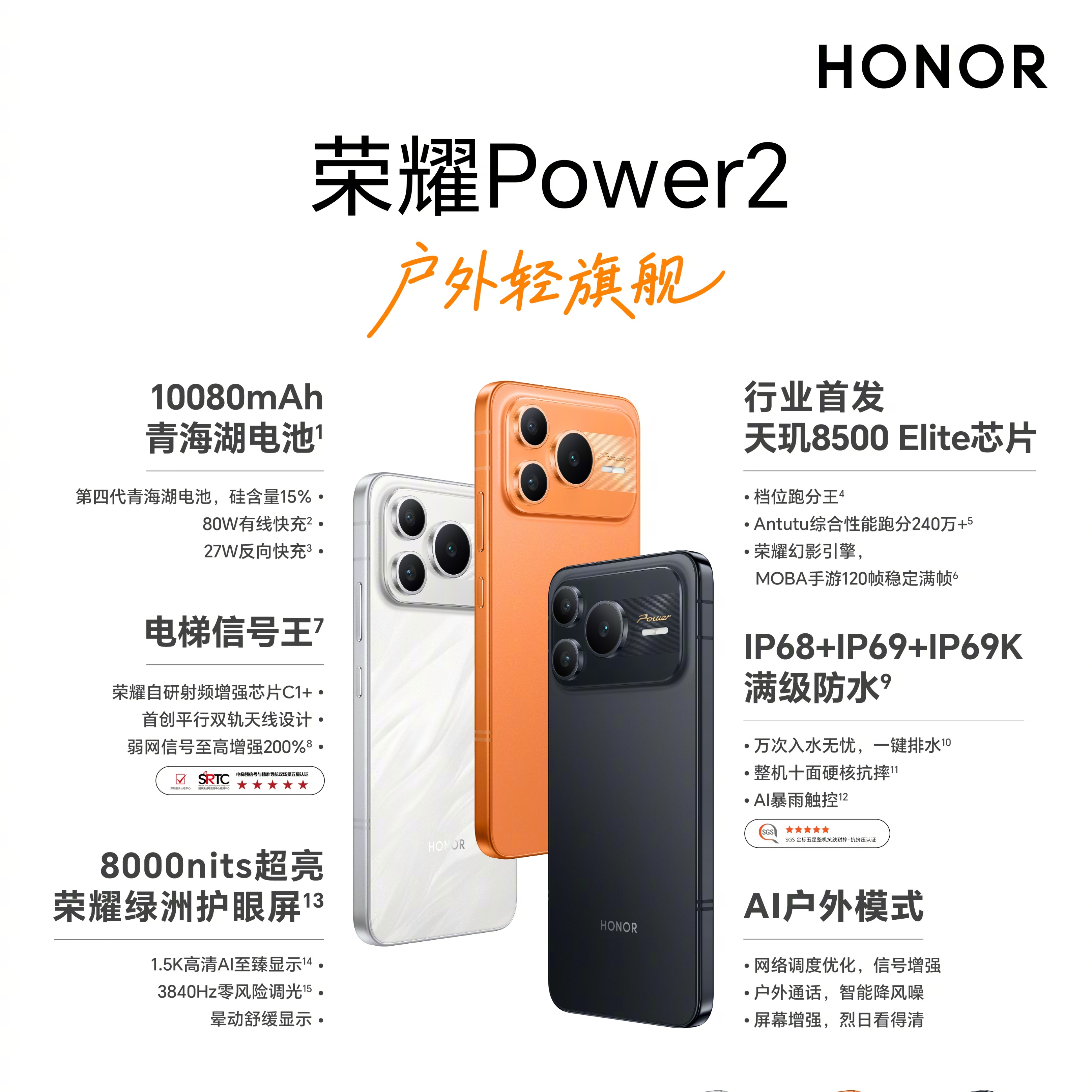 排名第五的是荣耀X70,抗跌防水和超大电池的组合还是挺好使的,相似配置的机型还有vivo Y500和OPPOA6等等,不过销量最好的还是荣耀X70。主打轻薄和大电池的荣耀500成绩也不错,在畅销榜中排在第12名,然后是两款定位更低的畅玩系列机型。需要重点分享的是荣耀Power2,该机的开售时间是1月9日,核心卖点是10080mAh电池、抗跌耐摔机身和天玑8500处理器,12GB+256GB版2699元。