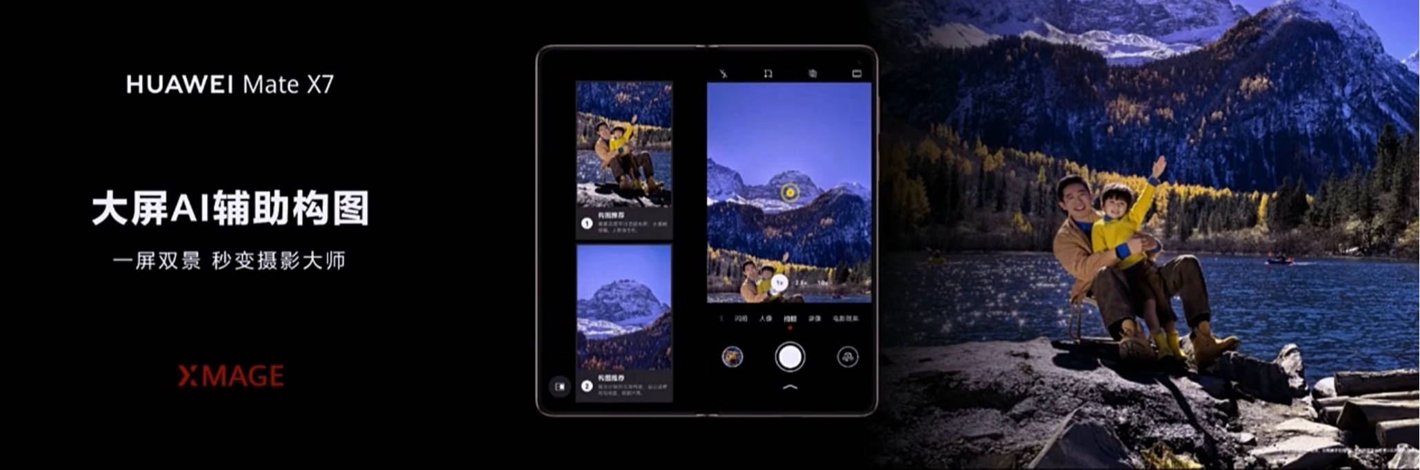 HUAWEI Mate X7独创的大屏拍照智能构图,让用户仅需根据屏幕的AI引导线调整拍摄角度,即可以轻松收获构图专业、主体突出的高品质影像。与直板机单一建议点不同,其折叠屏可左右分屏,实时提供双构图预览,用户只需将取景框中心的圆圈移向心仪的预览图,相机就会自动变焦并拍摄出对应构图的照片,真正感受“轻松出大片”。