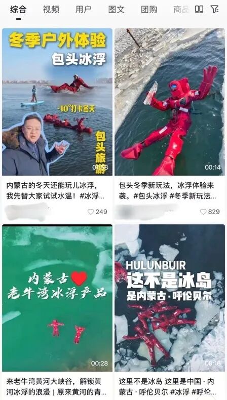 “冰镇小龙虾”是今年才爆火的冰雪新玩法——不冻河冰浮。在北方不冻河面上年轻人们穿着特制的保温服,像一具“浮尸”静静从上游漂到下游。由于保温服多为红色,从天空俯瞰漂在河上的年轻人,酷似一只只被冰镇的小龙虾。“冰浮”原本是北欧传统的冰雪玩法,如今被引入到国内后,“不用去北欧也能体验最地道的冬季冰浮”成为吸引年轻人的一大噱头,更被看作是一个极具性价比的平替玩法,在年轻人中大受追捧。
