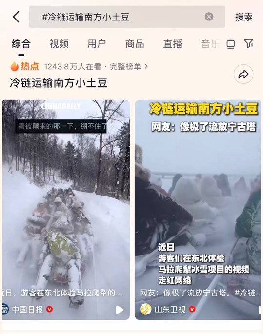 “流放宁古塔”早在上一个雪季就火过一阵,今年这一项目迎来史诗级强化。在东北多家景区,马拉爬犁被进一步改造,年轻游客们穿着大花棉袄,披着羊皮毯子,几个人一组猫在爬犁里,尽管大雪纷飞下自己在缓慢行驶的爬犁上都快被掩埋了,但每个人都异常兴奋的一边放着“雪花飘飘”的凄惨的音乐,一边举着手机咔咔一顿拍。东北当地人无不震惊于这些南方小土豆的抗冻能力,由此催生出一个爆梗——“冷链运输南方小土豆”,在社交媒体上火得一塌糊涂。